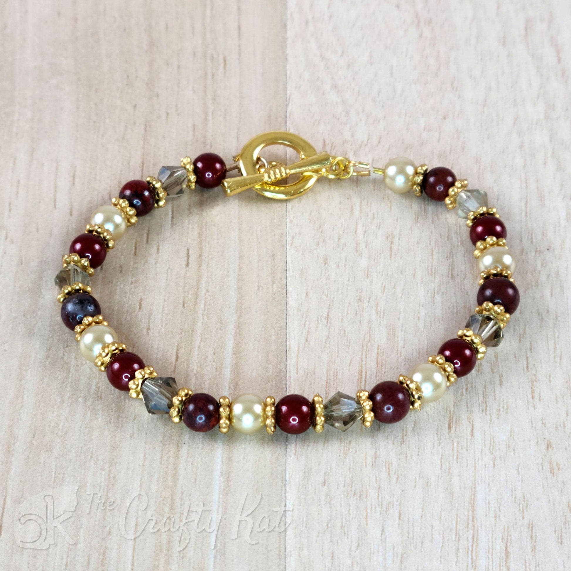 The Roman goddess of wisdom, justice, trade, and the arts, Minerva is the Roman counterpart to the Grecian goddess Athena. As a part of the Pantheon collection, this bracelet features red jasper rounds, ivory and burgundy glass pearls, and smoky topaz bicone crystals.